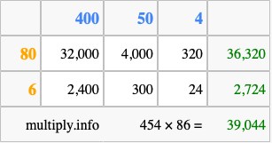 Finally, we add up all the sums we found in step 3 to get our final answer to 454 times 86.