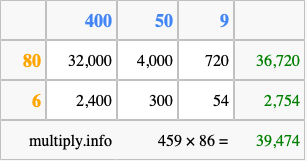 Finally, we add up all the sums we found in step 3 to get our final answer to 459 times 86.