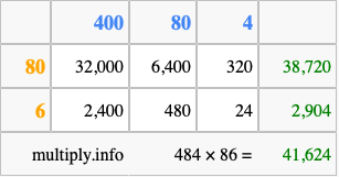 Finally, we add up all the sums we found in step 3 to get our final answer to 484 times 86.