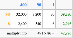 Finally, we add up all the sums we found in step 3 to get our final answer to 491 times 86.