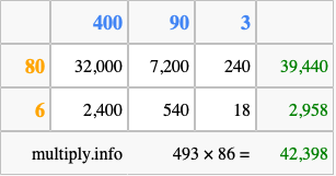 Finally, we add up all the sums we found in step 3 to get our final answer to 493 times 86.