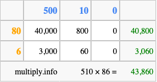 Below is an illustration showing you how to calculate 510 times 86 using the box method, using the instructions above.