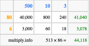 Below is an illustration showing you how to calculate 513 times 86 using the box method, using the instructions above.