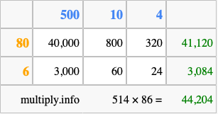 Finally, we add up all the sums we found in step 3 to get our final answer to 514 times 86.