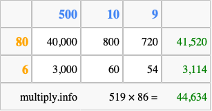 Below is an illustration showing you how to calculate 519 times 86 using the box method, using the instructions above.