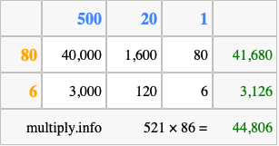 That's all there is to it! As you can see from the box above, the answer to 521 times 86 using the box method is 44,806.