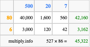 Below is an illustration showing you how to calculate 527 times 86 using the box method, using the instructions above.