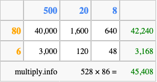 That's all there is to it! As you can see from the box above, the answer to 528 times 86 using the box method is 45,408.