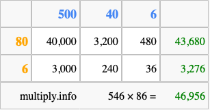 Finally, we add up all the sums we found in step 3 to get our final answer to 546 times 86.