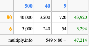 Finally, we add up all the sums we found in step 3 to get our final answer to 549 times 86.