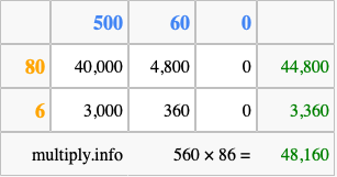 That's all there is to it! As you can see from the box above, the answer to 560 times 86 using the box method is 48,160.