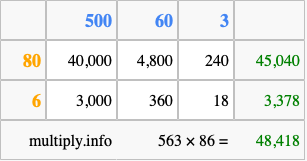Finally, we add up all the sums we found in step 3 to get our final answer to 563 times 86.