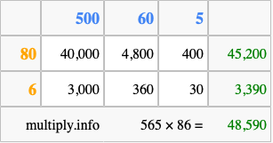 Finally, we add up all the sums we found in step 3 to get our final answer to 565 times 86.