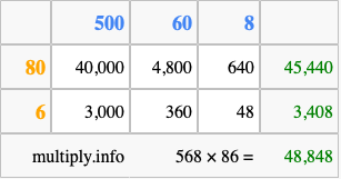 That's all there is to it! As you can see from the box above, the answer to 568 times 86 using the box method is 48,848.