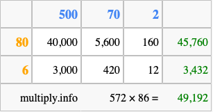 That's all there is to it! As you can see from the box above, the answer to 572 times 86 using the box method is 49,192.
