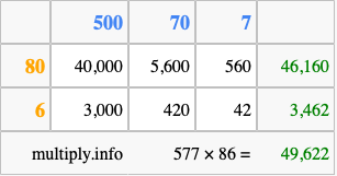 That's all there is to it! As you can see from the box above, the answer to 577 times 86 using the box method is 49,622.