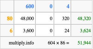 Finally, we add up all the sums we found in step 3 to get our final answer to 604 times 86.