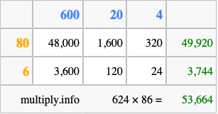 Finally, we add up all the sums we found in step 3 to get our final answer to 624 times 86.