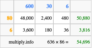 Finally, we add up all the sums we found in step 3 to get our final answer to 636 times 86.