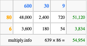 That's all there is to it! As you can see from the box above, the answer to 639 times 86 using the box method is 54,954.