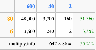 Finally, we add up all the sums we found in step 3 to get our final answer to 642 times 86.