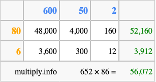 That's all there is to it! As you can see from the box above, the answer to 652 times 86 using the box method is 56,072.