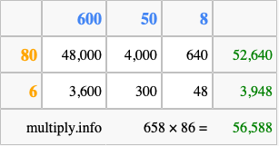 Finally, we add up all the sums we found in step 3 to get our final answer to 658 times 86.