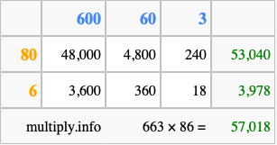 That's all there is to it! As you can see from the box above, the answer to 663 times 86 using the box method is 57,018.