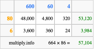 Finally, we add up all the sums we found in step 3 to get our final answer to 664 times 86.