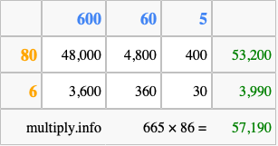Finally, we add up all the sums we found in step 3 to get our final answer to 665 times 86.