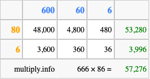 Finally, we add up all the sums we found in step 3 to get our final answer to 666 times 86.