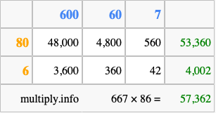 Finally, we add up all the sums we found in step 3 to get our final answer to 667 times 86.
