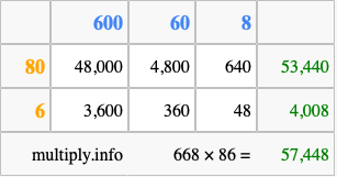 Finally, we add up all the sums we found in step 3 to get our final answer to 668 times 86.