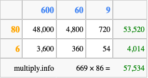 Finally, we add up all the sums we found in step 3 to get our final answer to 669 times 86.