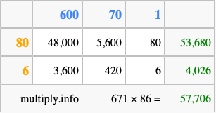 Finally, we add up all the sums we found in step 3 to get our final answer to 671 times 86.