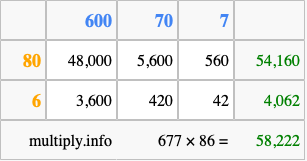 That's all there is to it! As you can see from the box above, the answer to 677 times 86 using the box method is 58,222.