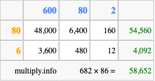 Finally, we add up all the sums we found in step 3 to get our final answer to 682 times 86.