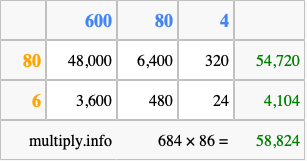 Finally, we add up all the sums we found in step 3 to get our final answer to 684 times 86.