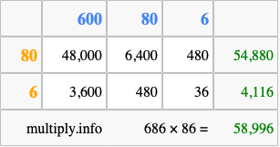 That's all there is to it! As you can see from the box above, the answer to 686 times 86 using the box method is 58,996.