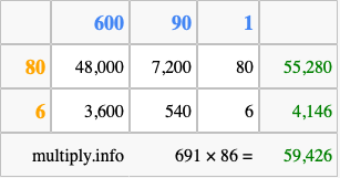 Below is an illustration showing you how to calculate 691 times 86 using the box method, using the instructions above.