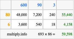 That's all there is to it! As you can see from the box above, the answer to 693 times 86 using the box method is 59,598.