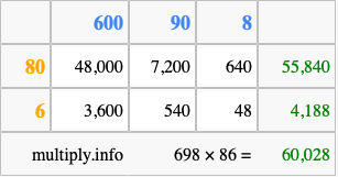 That's all there is to it! As you can see from the box above, the answer to 698 times 86 using the box method is 60,028.
