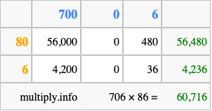 Finally, we add up all the sums we found in step 3 to get our final answer to 706 times 86.