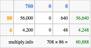 That's all there is to it! As you can see from the box above, the answer to 708 times 86 using the box method is 60,888.