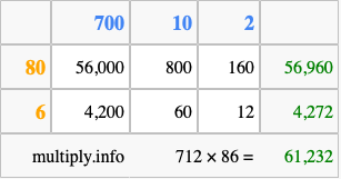 Finally, we add up all the sums we found in step 3 to get our final answer to 712 times 86.
