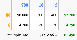 Finally, we add up all the sums we found in step 3 to get our final answer to 715 times 86.