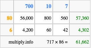 Finally, we add up all the sums we found in step 3 to get our final answer to 717 times 86.