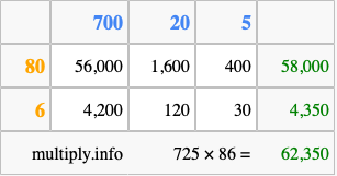 Finally, we add up all the sums we found in step 3 to get our final answer to 725 times 86.