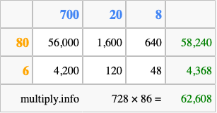 Finally, we add up all the sums we found in step 3 to get our final answer to 728 times 86.