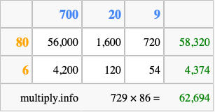 Finally, we add up all the sums we found in step 3 to get our final answer to 729 times 86.